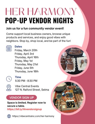 Her Harmony is dedicated to showcasing local talent and services by creating a collaborative space where small businesses can thrive together. Join us as we connect, elevate, and support our community’s entrepreneurs